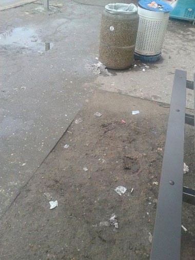 Вместо асфалт или плочки има пръст и съответно кал. Така чакащия не може да достигне до седалките.