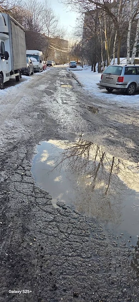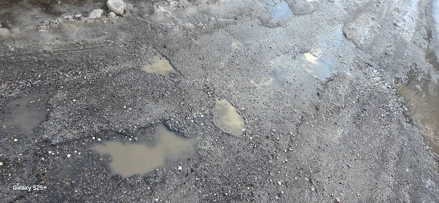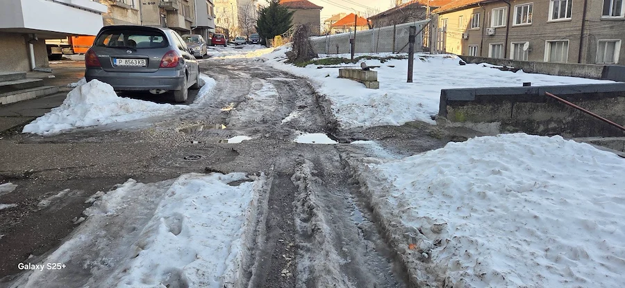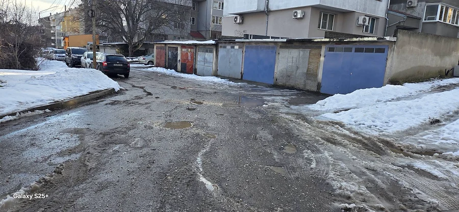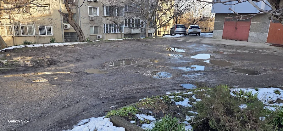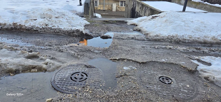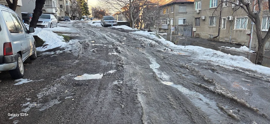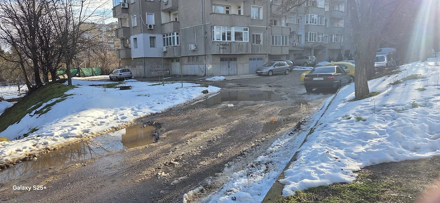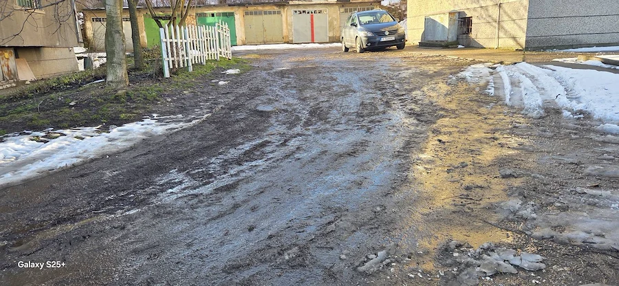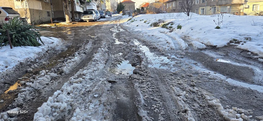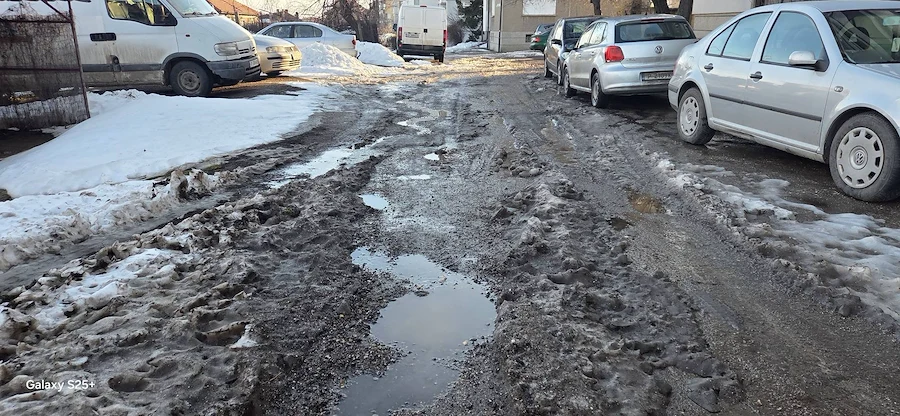 Снимковият материал, заснет непосредствено след снеготопенето, разкрива тежка картина – липса на здрава настилка, огромни трапове, пълни с вода, и кал, която прави преминаването на пешеходци почти невъзможно. Автомобилите също преминават с огромно затруднение през образувалите се дълбоки улеи.