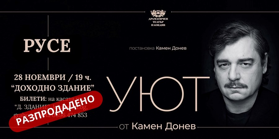 Един от най-обичаните български актьори и режисьори ще зарадва русенската публика със своя авторски спектакъл. Камен Донев ще представи постановката "Уют" на 28 ноември 2024 година от 19:00 часа в Голямата зала на Доходното здание в град Русе.