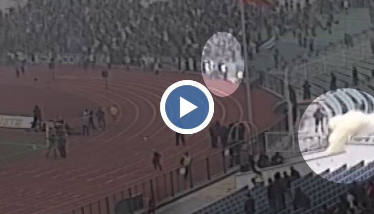 На една от камерите, монтирана под козирката на Националния стадион, е уловен моментът на инцидента - хвърлянето на бомбичката и взривът, който пръска стъклена врата и ранява двама полицаи в един от входовете на стадиона.