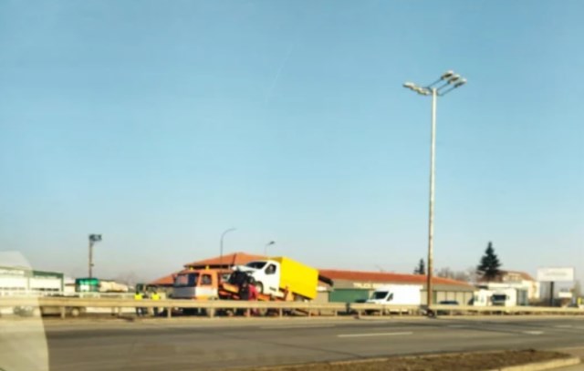 В момента товарят удареният камион на Пътна помощ, а движението е отклонено.