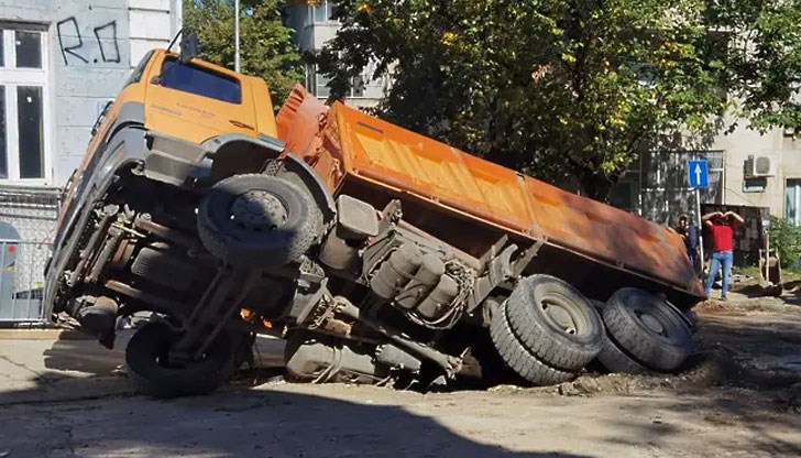 В момента на инцидента шофьорът е бил в камиона, дал е на заден ход и е пропаднал. За щастие не е пострадал.