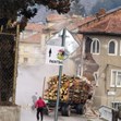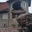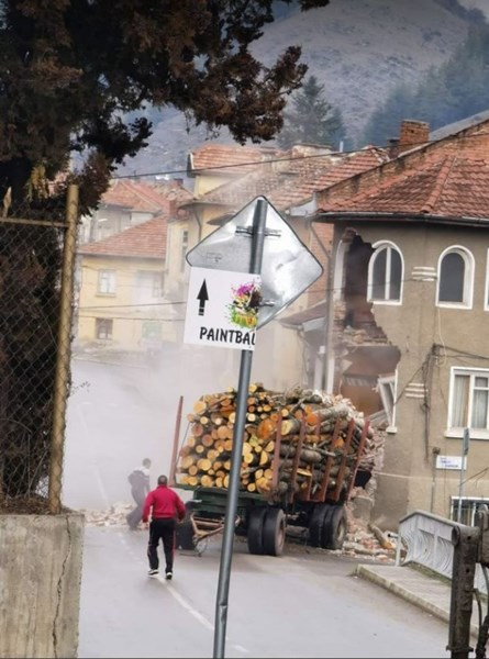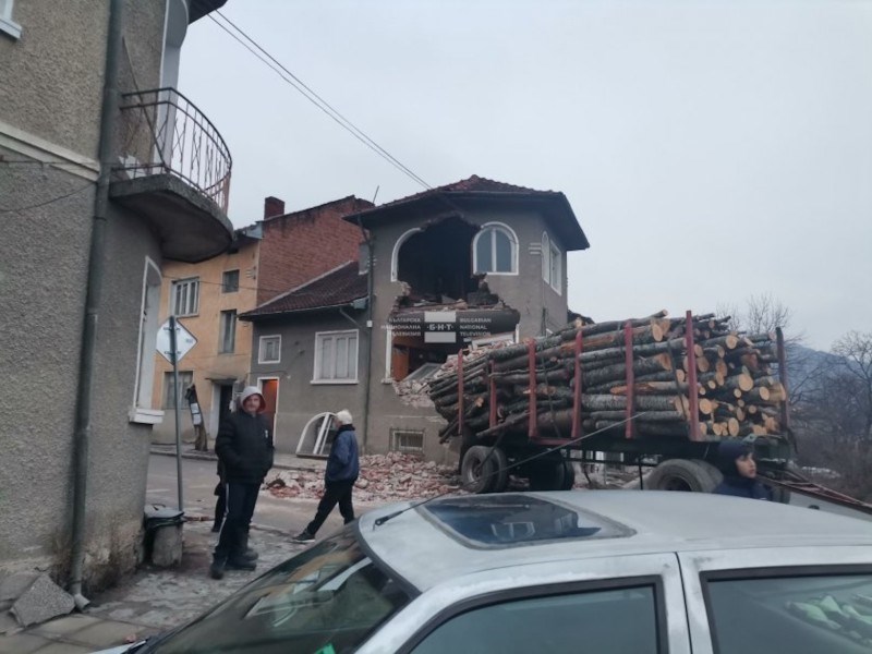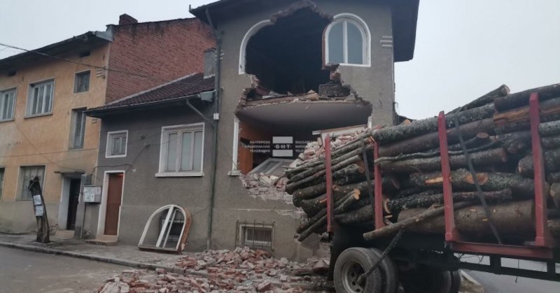 Претоварен с дървен материал камион събори част от къща в Белица, преди минути.
