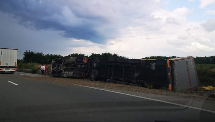 Камионът се е обърнал извън пътното платно и не пречи на движението.