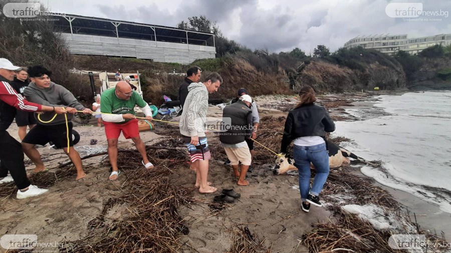 Хората са създали организация, за да изтеглят кравата от бурното море. С помощта на въжета са превързали рогата ѝ, за да я издърпат на брега. Скоро след това състоянието на животното се е подобрило, споделят курортистите, цитирани от TrafficNews.bg.