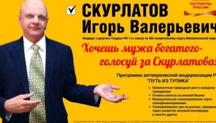 Кандидат депутат от партията „Патриотите на Росия” Игор Скурлатов привлече вниманието с куриозен предизборен слоган.