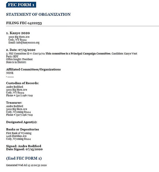 Сайтът на Федералната избирателна комисия на САЩ (FEC) представи попълнен формуляр за участието на Уест от партията "BDY" в надпреварата за президент.
