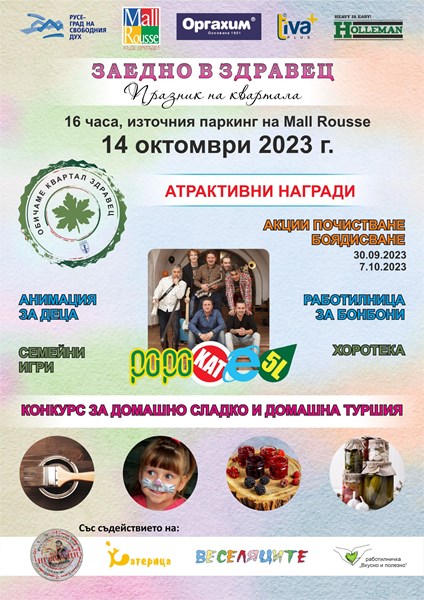 Русенци ще могат да се включат в два кулинарни конкурса с атрактивни награди по време на инициативата „Празник на квартала – Заедно в Здравец“. Тя ще се проведе на 14 октомври /събота/ от 16:00 ч. на източния паркинг на Mall Rousse, а желаещите ще могат да премерят възможностите си в приготвянето на домашни сладка и туршии.