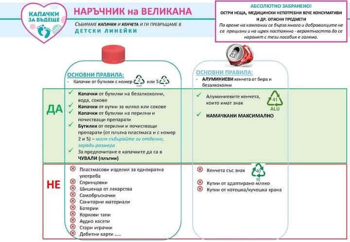 Организаторите подчертават, че е строго забранено да се носят остри предмети, медицински отпадъци, използвани инжекции и други опасни материали. Доброволците, които ще събират капачките и кенчетата, нямат право да приемат такива отпадъци, и в случай че такива се донесат, организаторите не носят отговорност за тяхната безопасност.