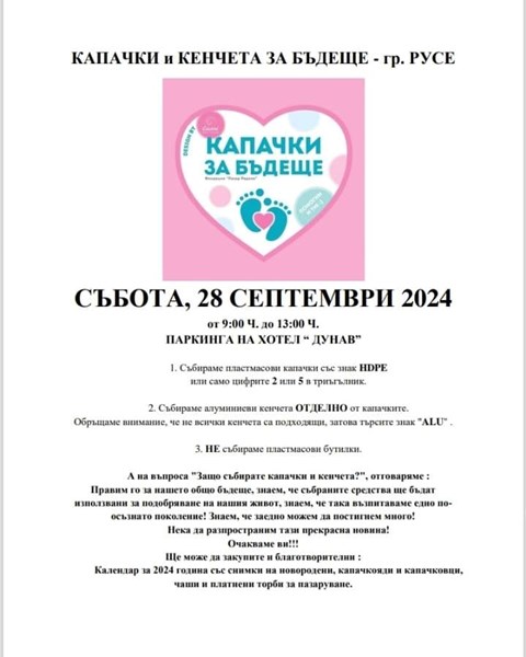 На 28 септември 2024 година в град Русе ще се проведе благотворителна кампания "Капачки и кенчета за бъдеще". Събитието ще се състои от 9:00 часа до 13:00 часа на паркинга на хотел „Дунав“.
