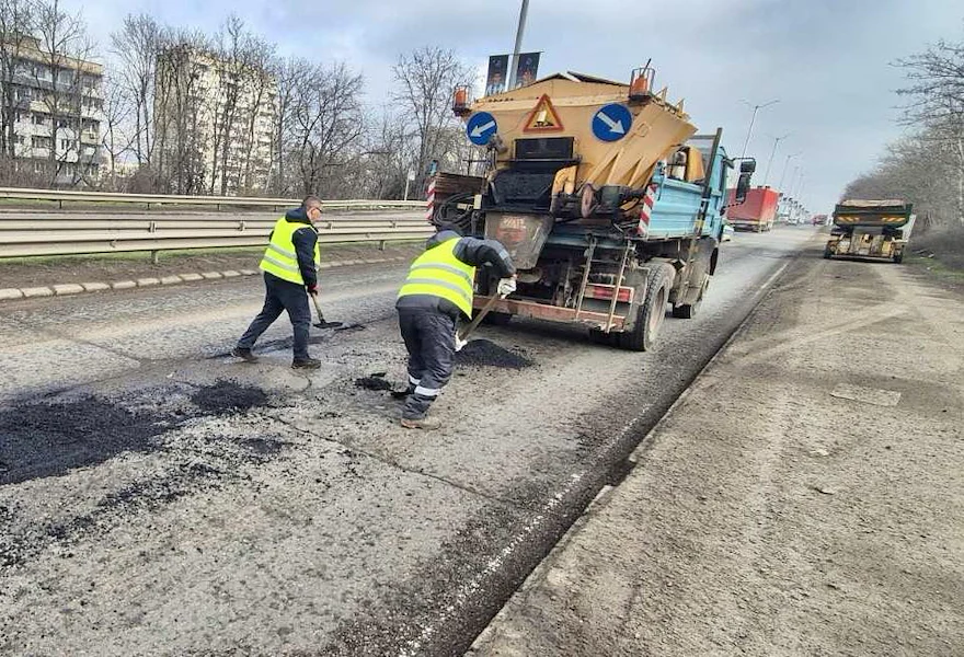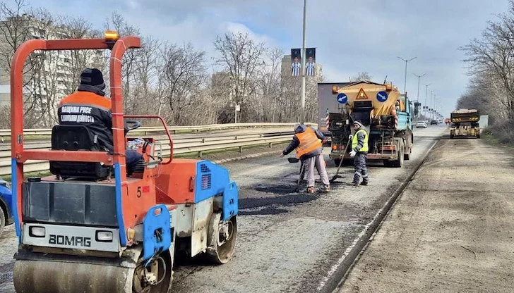 Общински екипи извършват неотложни ремонтни дейности по настилката на булевард "България" днес, 11 февруари 2026 г. Акцията е в отговор на множеството разрушения по трасето, което поема основния тежкотоварен трафик към Дунав мост.
