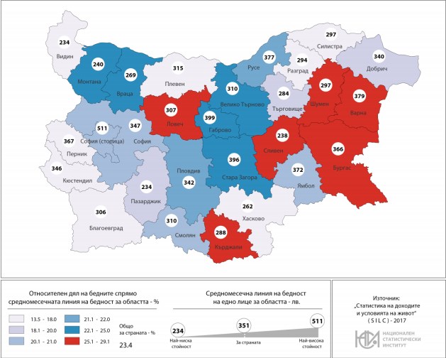 През 2017 г. най-ниската линия на бедност се наблюдава в областите Видин и Пазарджик - съответно по 234 лв., а най-високата - в област София (столица) (511 лв.), следвана от областите Габрово (399 лв.) и Стара Загора (396 лeвa).