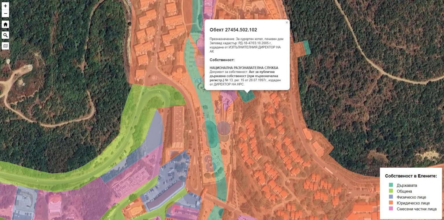 Картата на собствеността показва и наличието на няколко ключови държавни имота в непосредствена близост до засегнатата зона. Сред тях е сграда на Националната разузнавателна служба, разположена точно над аквапарка, който е построен върху самата река.