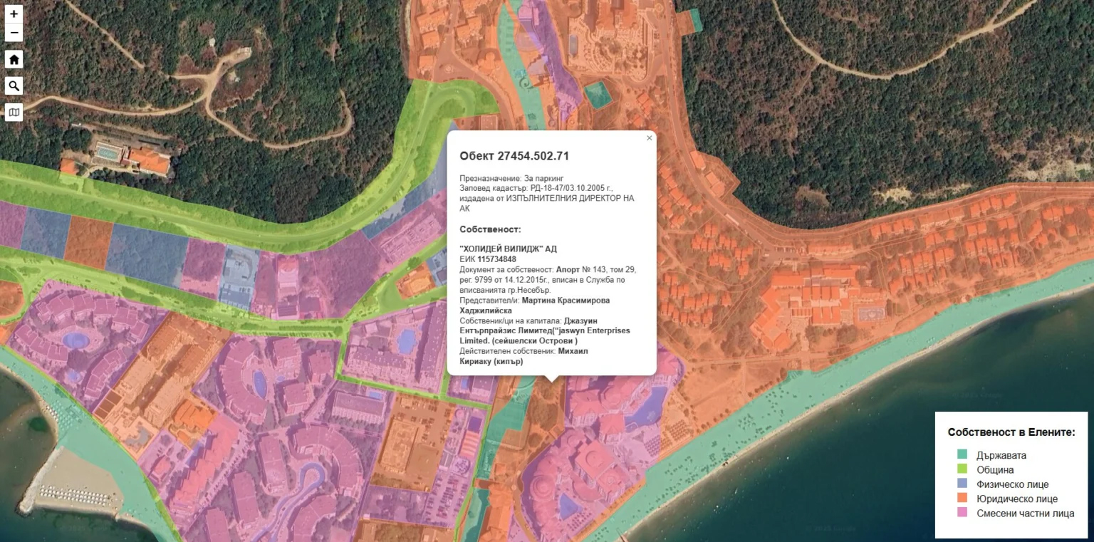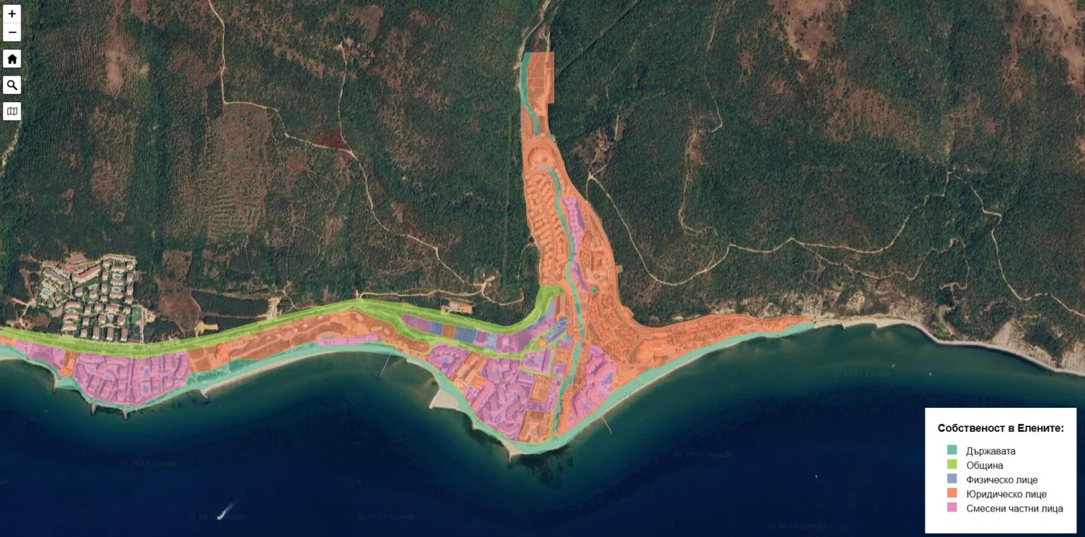 Анализ на данни от кадастъра, представен под формата на интерактивна карта от блогъра и анализатор Боян Юруков, разкрива детайли за собствеността на имотите в района на курортния комплекс "Елените", който пострада от тежки наводнения в началото на месеца. Картата показва, че значителна част от земите по протежението на реката са държавна, общинска и частна собственост, като сред частните собственици се открояват офшорни компании.