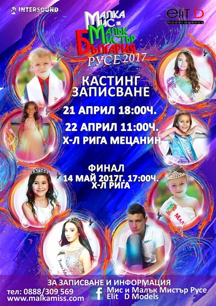 На 21 април от 18.00 часа и на 22 април от 11.00 часа, агенция "Елит Д Моделс" организира в х-л „Рига“ кастинг за участници в регионалния кръг на конкурса "Малка Мис и Малък Мистър България".