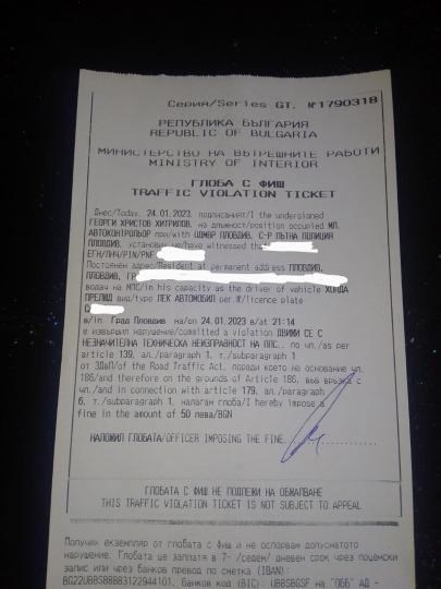 ×Варненец: Вместо да пишеш тъпотии в нета и да се излагаш, внимателно прочети Закона за движение по пътищата и го запомни, а след това го разясни и на сина си!!! И как точно полицията го принудила да подпише глоба, с която не е съгласен?! Някой от полицаите му хванал ръката и му я местел насам-натам, докато докара подписа му ли?! Като е толкова отворен, да каже, че не е съгласен с глобата, няма да подпише фиша и ще му съставят акт. После го жалете щом мислите, че това не е нормално?!?!?!?!?