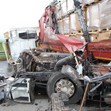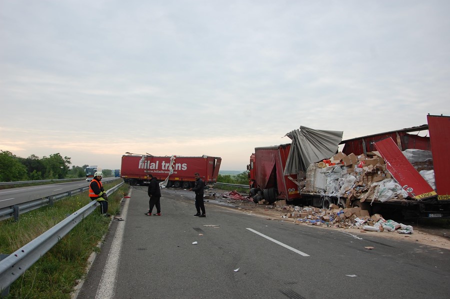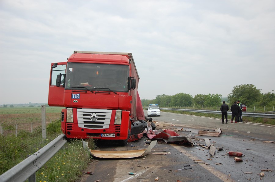 Камион с българска регистрация е бил спрял заради спукана предна гума. Докато шофьорът е сменял гумата, в задната му част се е ударил друг камион, с водач турски гражданин.