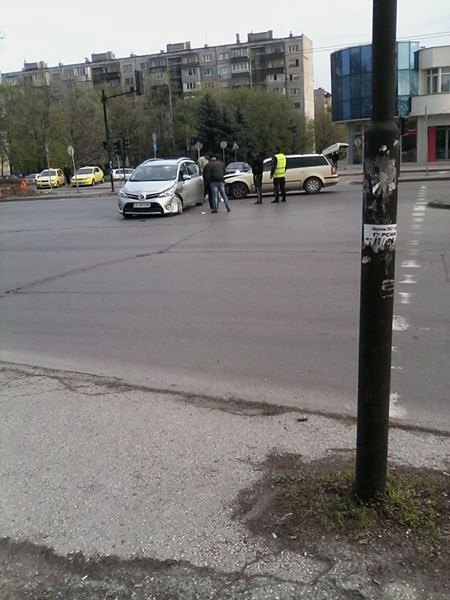 Ц. Николов сподели в социалната мрежа, че "Тойота" и "Фолксваген Пасат" са се сблъскали на кръстовището, близо до магазина на "Нисан".