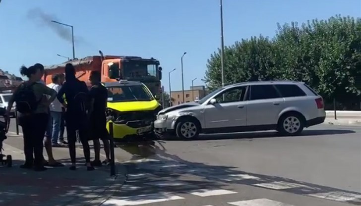 Затова алармират очевидци, публикували снимки в социалните мрежи. От тях се вижда, че таксиметрова кола и ауди са се ударили, явно неспазвайки правилата за предимство на пътя.