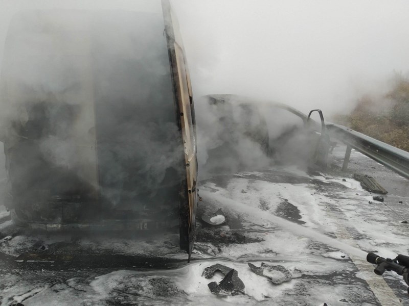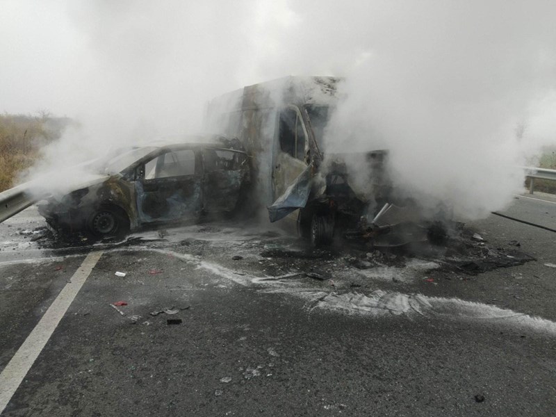 "След катастрофата единият от автомобилите се е запалил. Предстои да бъде изяснено дали загиналият човек е починал при инцидента, или в резултат на пожара. На мястото все още екипи на пожарната, които гасят. Останалите участници в катастрофата нямат сериозни травми и наранявания, на мястото има и екипи на спешна помощ.