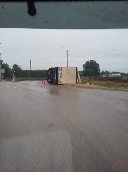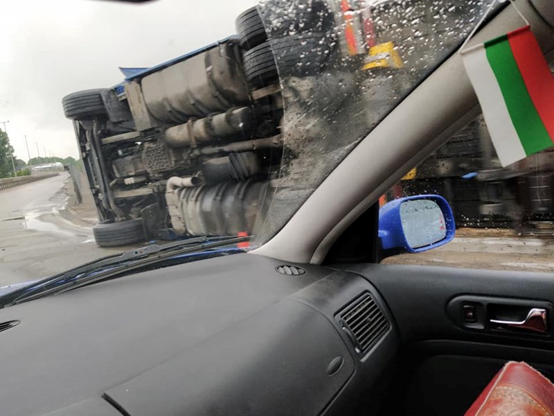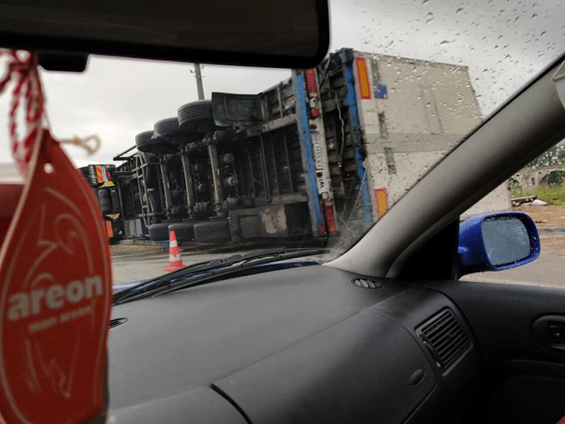 Произшествието е възникнало около 23:50 ч., на пътя I-5, км 51+800, като влекач "Рено" с украинска регистрация (с прикачено полуремарке, натоварено с пелети), управляван от 53-годишен водач, при излизане от кръговото кръстовище (в посока гр. В.Търново) е напуснал пътя вдясно, преобръщайки се встрани. Водачът е тежко пострадал, откаран е и настанен в болница в Русе с контузно-разкъсни рани на двете ръце, без опасност за живота.