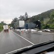 Най-вероятно пътният инцидент е станал при разминаване на двете превозни средства. При удара единият товарен автомобил се е обърнал и по платното има разпилян товар. Няма пострадали.