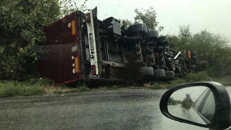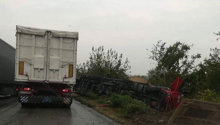 Затруднено е движението по пътя между Велико Търново и село Поликраище, преди моста в посока областния център. Няма пострадали хора. Движението се регулира от служители на „Пътна полиция“ и има образувала се колона от автомобили, поради което преминаването отнема известно време.