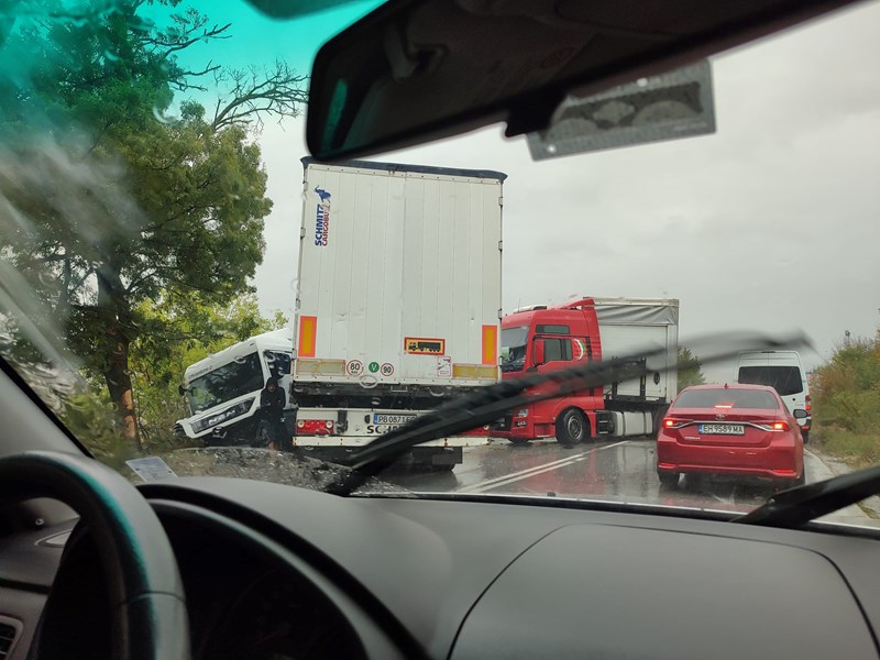 Според очевидци, тежкотоварният автомобил се е завъртял и е блокирал едното платно на пътя, докато лекият автомобил е излетял в крайпътната канавка. Пътната обстановка е усложнена от валящия дъжд, който прави настилката хлъзгава и опасна.