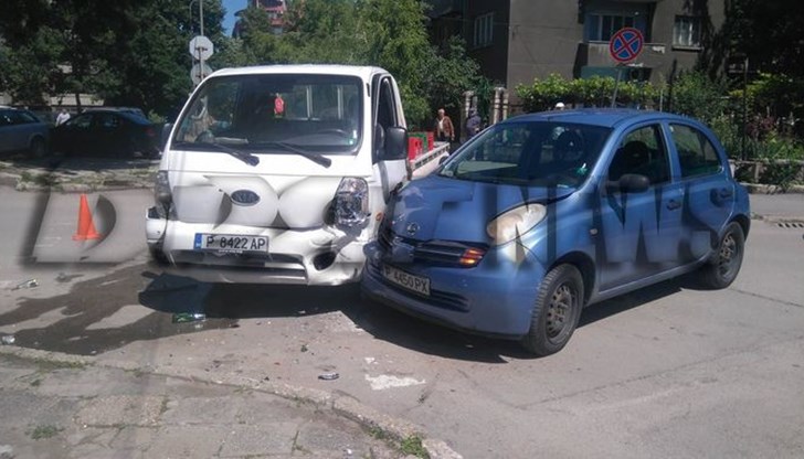 Блъснали са се "Нисан" и фирмен автомобил "Киа", доставяща напитки на едро. Най-вероятната причина за сблъсъка е отнето предимство.