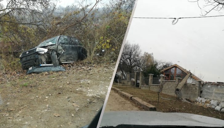 Автомобилът се е блъснал в стълб на уличното осветление, като буквално го е изтръгнал и захвърлил върху оградата на къща в близост.