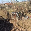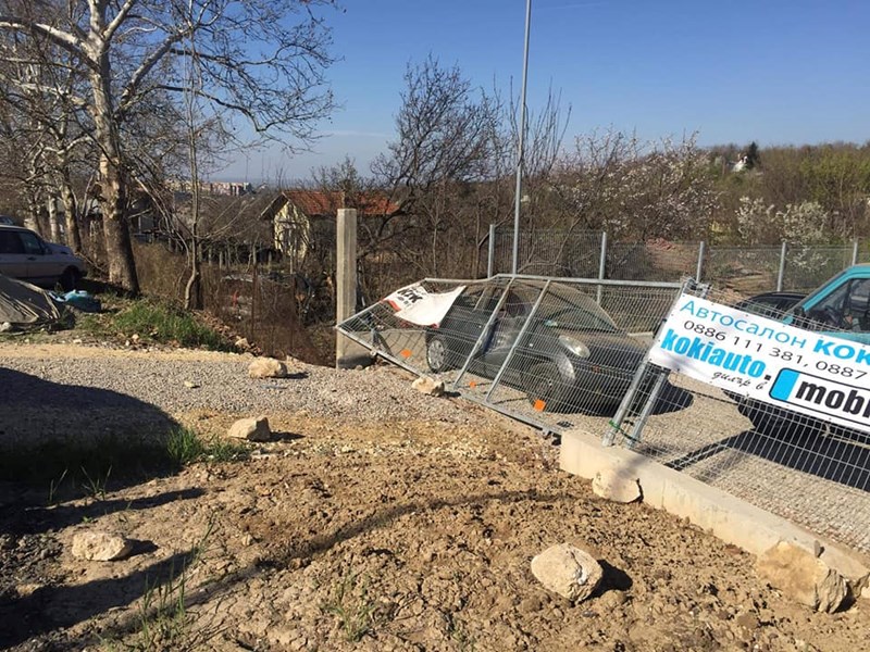 Лек автомобил е "прелетял" между бетонна колона и Нисан Микра и се е озовал в двора на къща. При удара е отсечено дърво, а Нисан-ът е пострадал при падане на ограда върху него.