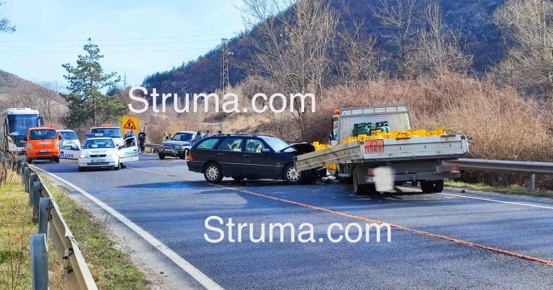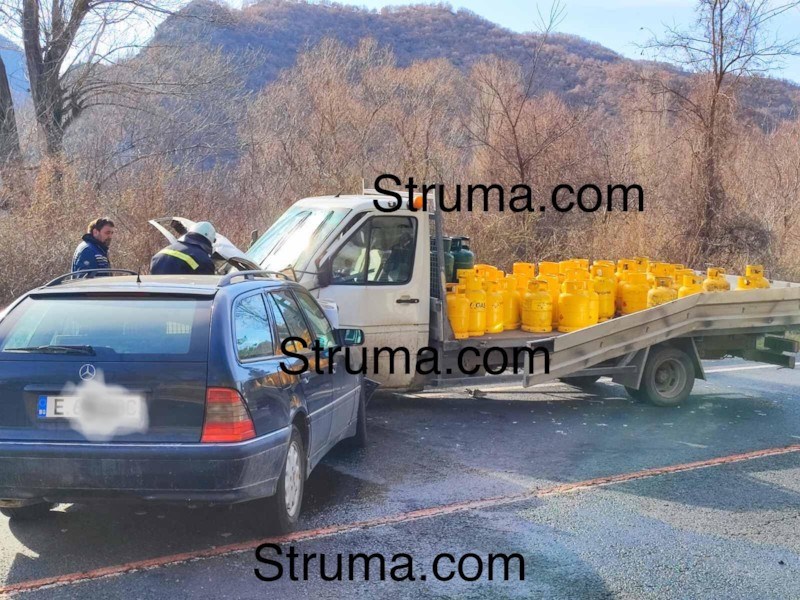 Микробус, превозващ газови бутилки и лека кола са се ударили в района на село Железница край Симитли. Главният път Е-79 временно е затворен, а автомобилите се пренасочват по стария път през Симитли, Железница и Черниче.