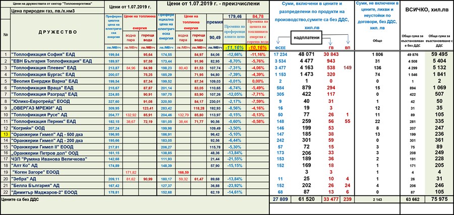 За „Топлофикация София“ ЕАД предлаганата годишна прогнозна цена на топлинната енергия за битовите потребители е в размер на 81,57лв./MWh, за „ЕВН Топлофикация“ ЕАД – 83,20 лв./MWh, за „Топлофикация Плевен“ ЕАД – 71,87 лв./MWh,за „Топлофикация Бургас” ЕАД – 69,72 лв./MWh, „Веолия Енерджи Варна” ЕАД - 85,06 лв./MWh.
