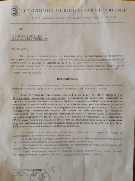 Предписанието е подписано и подпечатано от кмета на района Милко Младенов.