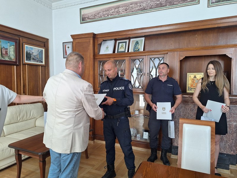 Кметът на Плевен д-р Валентин Христов днес връчи благодарствени грамоти на тримата полицейски служители и гражданин, които спасиха живота на 9-годишно момиче при инцидент с токов удар във вторник вечерта. Церемонията се проведе в сградата на Общината в присъствието на ръководството на ОДМВР – Плевен.