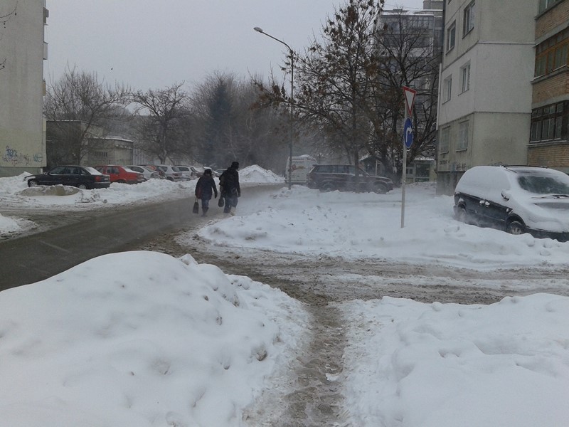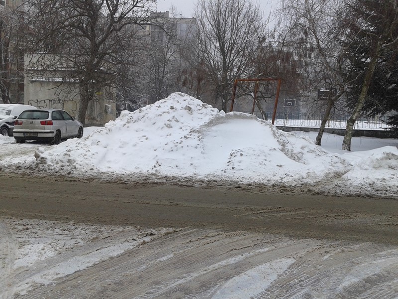 Огромни камари сняг са изсипани от снегопочистващите фирми директно върху тротоара. По този път всеки ден минават деца, отиващи в училище "Възраждане". Принудени са да заобиколят голямата планина от сняг, за да се качат на тротоара, като преди това са ходили от единия, че на другия тротоар, за да се предпазят от минаващите коли.