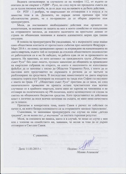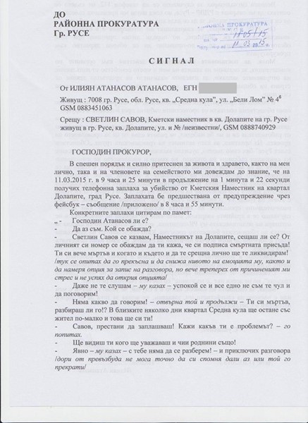 Г-н Атанасов е член на групата Обществен съвет. В жалбата, която е подал се цитира телефонен разговор, проведен тази сутрин по инициатива на г-н Савов, при който са му били отправени заплахи за саморазправа от страна на наместника на кмета. Г-н Атанасов изразява съмнения, че има опасност за него и семейството му и моли за спешна намеса от страна на прокуратурата.