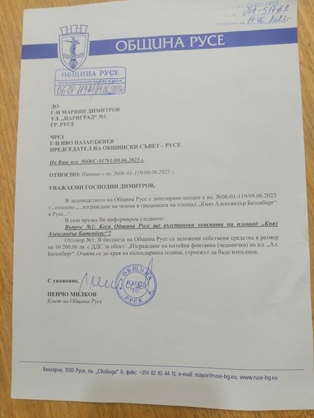 На 15 юни, на заседание на Общински съвет - Русе, Мариян Димитров направи питане на тема: "Кога ще бъде възстановена чешмата в градинката на площад „Княз Александър Батенберг“ в Русе?".