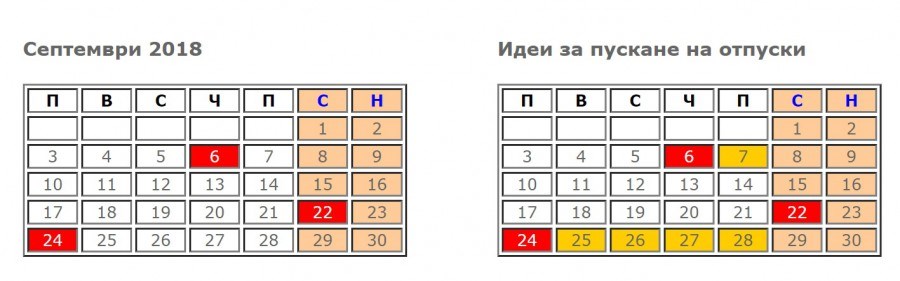 През месец септември 2018 година ще почиваме два пъти през двете половини на месеца.