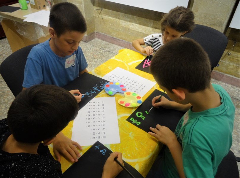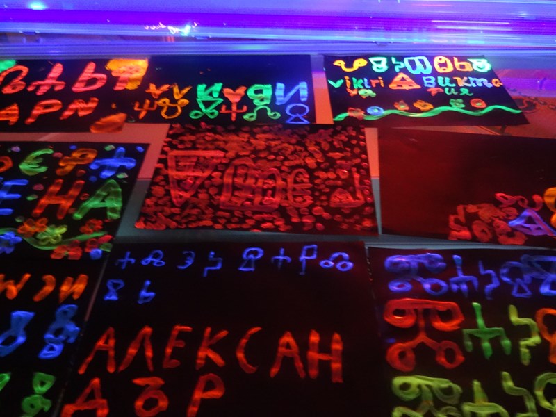 Интересни факти от живота на братята Кирил и Методий и създаването на славянската азбука, както и истории за първите писмени знаци малчуганите узнаха от книгите „Моята първа книга за Кирил и Методий“ на Цанко Лалев и „Кой е създал нашите букви“ на Надежда Драгова. Докато слушат текста, участниците влизат в ролята на калиграфи, изписвайки имената си на Глаголица. Миналото на буквите срещна бъдещето, когато децата поставиха своите изрисувани неонови имена под UV светлината, а релаксиращата музика и арома лампа допълниха техните изживявания.