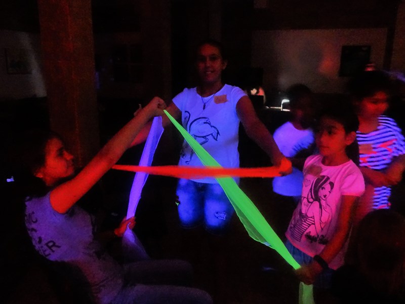 В ателие „Когато буквите танцуват“ децата научават повече за историята на буквите, за Глаголицата и Кирилицата. Под светлината на UV лампи, музика и с помощта на цветни шалове участниците редят букви, създават думи и измислят забавни рими. Предизвикателствата на игрите „Кълбо прежда“, „Фигури“ и „Огледално четене” провокират децата да разказват своя история, да изработват пластелинови фигури по зададена буква и разкодират написани наобратно думи.