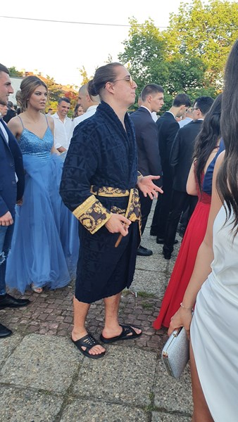 Младежът дефилира по халат и джапанки, вместо в изискан костюм в Кюстендил. Появата му предизвика десетки коментари в социалните мрежи.