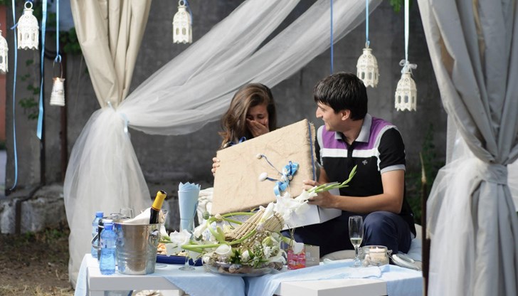 Красивият русенски залез става фон на любовното вричане на Елина и Владимир. Той изненадва половинката си с излет по залез на русенското пристанище. В построена за целта беседка и под майсторските изпълнения на акустична китара тя открива заветното „Омъжи се за мен!“, изписано върху захарни бисквитки.
