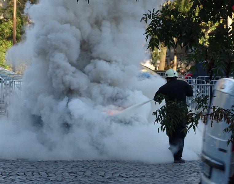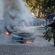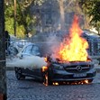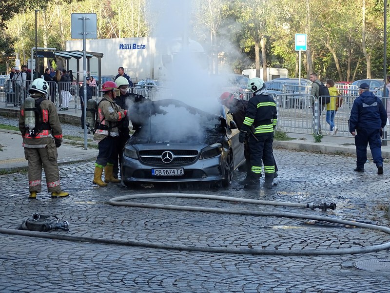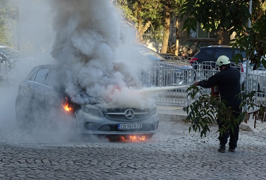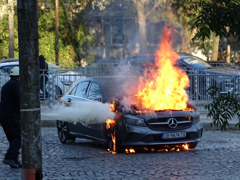 Луксозен автомобил с марка "Мерцедес" се оказа в пламъци точно срещу сградата на 6-то Районно полицейско управление.