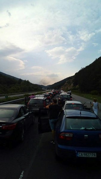 Причината е техническа неизправност в лек автомобил, който се е запалил. Няма пострадали. Движението към София временно е спряно.