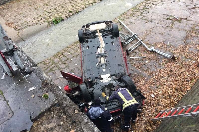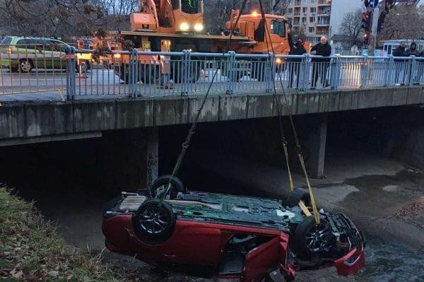 За да избегне удара, мъжът е навил волана и колата се е обърнала на таван в реката. На местопроизшествието има екипи на КАТ и на „Тежките“. По първоначална информация на очевидци другият автомобил се е движил с висока скорост и е засякъл пострадалите.
