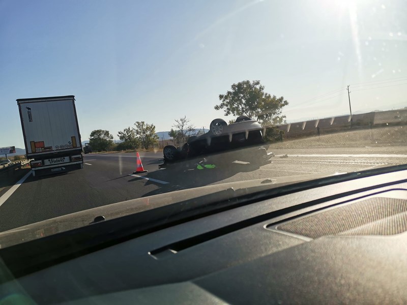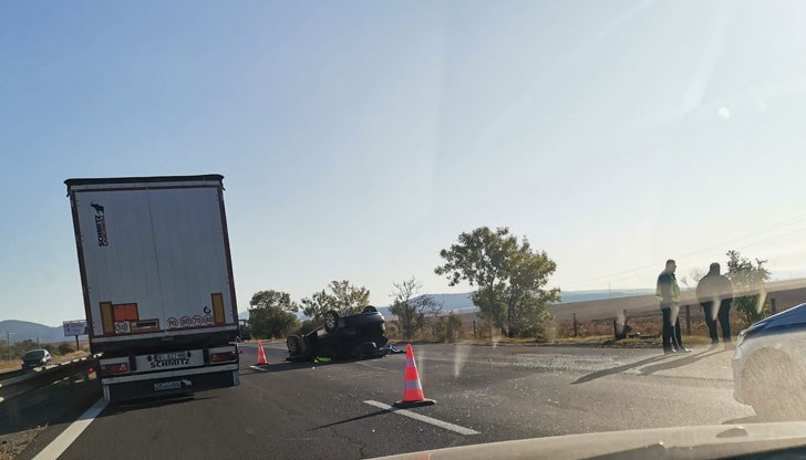 Катастрофата е станала между два леки автомобила. Единия е застигнал другия и след удара, автомобил се е обърнал по таван. Има двама пострадали. Движението за кратко се е осъществявало в изпреварващата лента, но вече е разчистено движението, съобщиха от МВР.