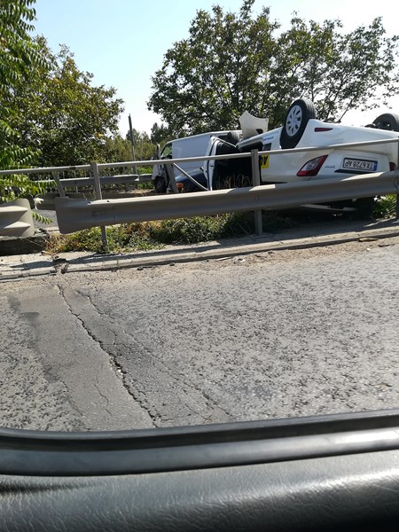 Потребители в социалната мрежа сигнализираха за инцидента, като все още не е ясно има ли пострадали хора. Ударът е станал между бус и служебен автомобил, движещ се по международния път. Според очевидци бусът най-вероятно е отнел предимството на леката кола. При сблъсъка автомобилът се е преобърнал по таван, точно до мантинелата на пътя.
