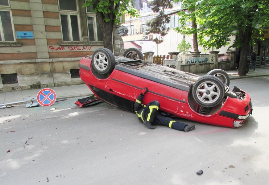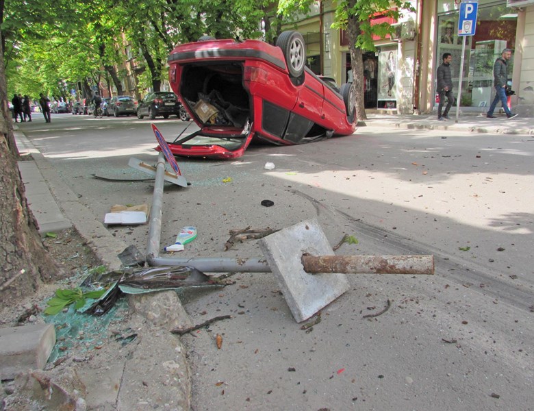 Кола се е обърнала по таван, като при удара е помела пътен знак, който буквално е изтръгнат от асфалта.