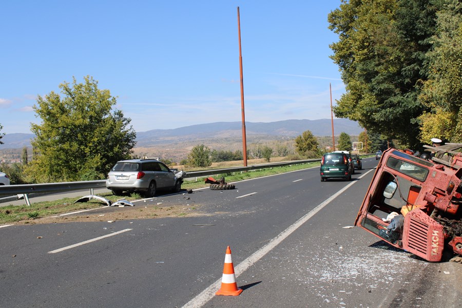 Кола се удари в откъснато колело на трактор на път Е-79